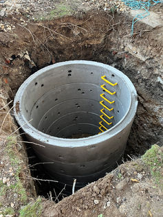 ![]() Concrete man-hole ring installed | ![]() all pipe-work surrounded in shingle |